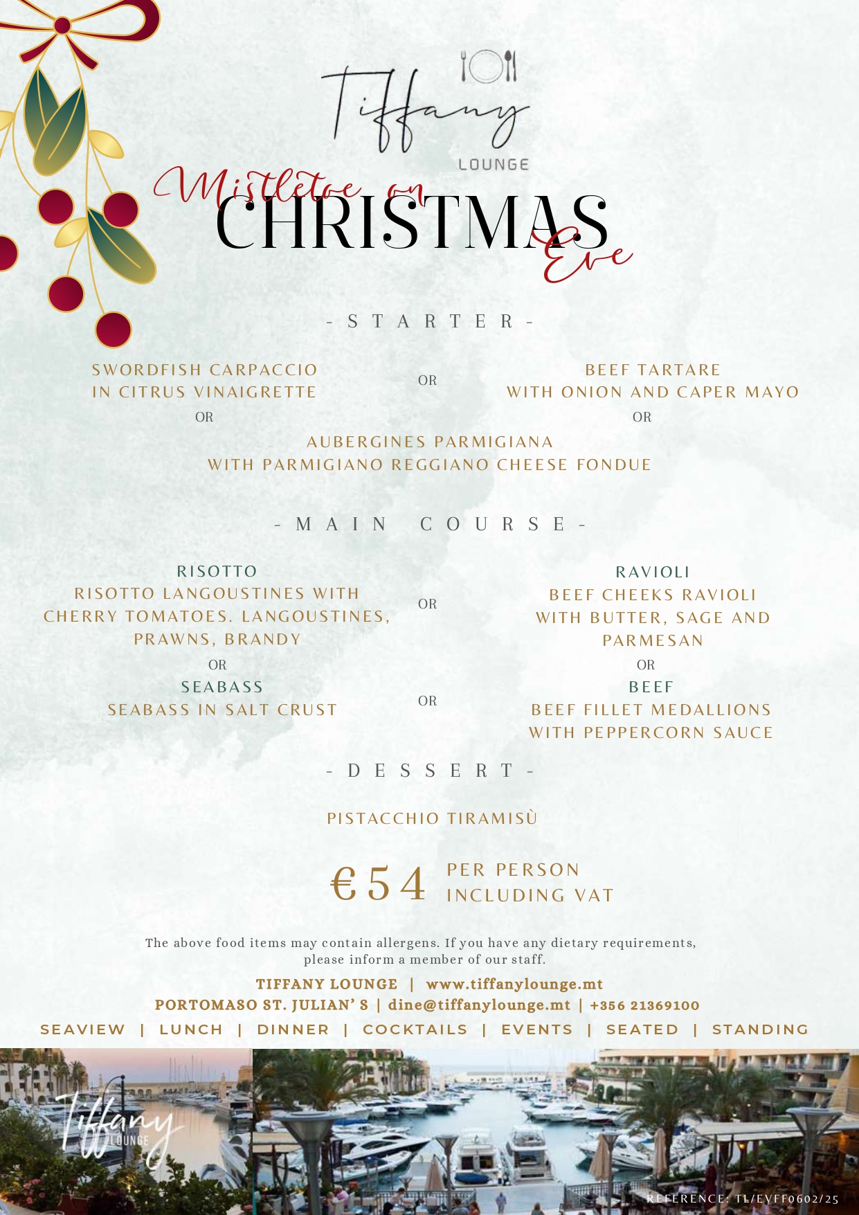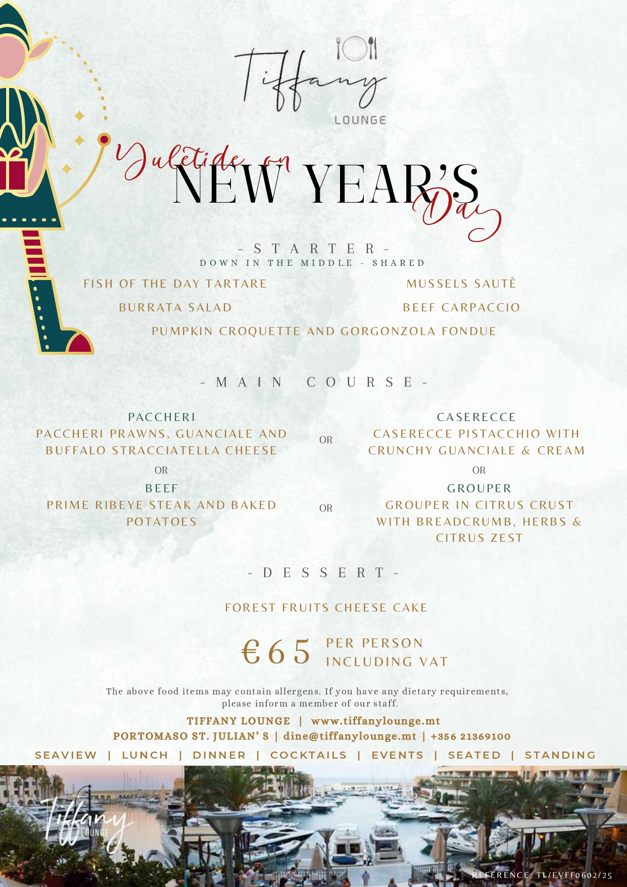 Tiffany Lounge 4 Days Events Christmas Eve Christmas Day New Year's Day New Year's Eve Party Christmas Eve Dinner on the 24th of December Download Menu Christmas Day Lunch on the 25th of December Download Menu New Year's Day lunch on the 1st of January 2025 Download Menu New Year's Eve Party Download Menu